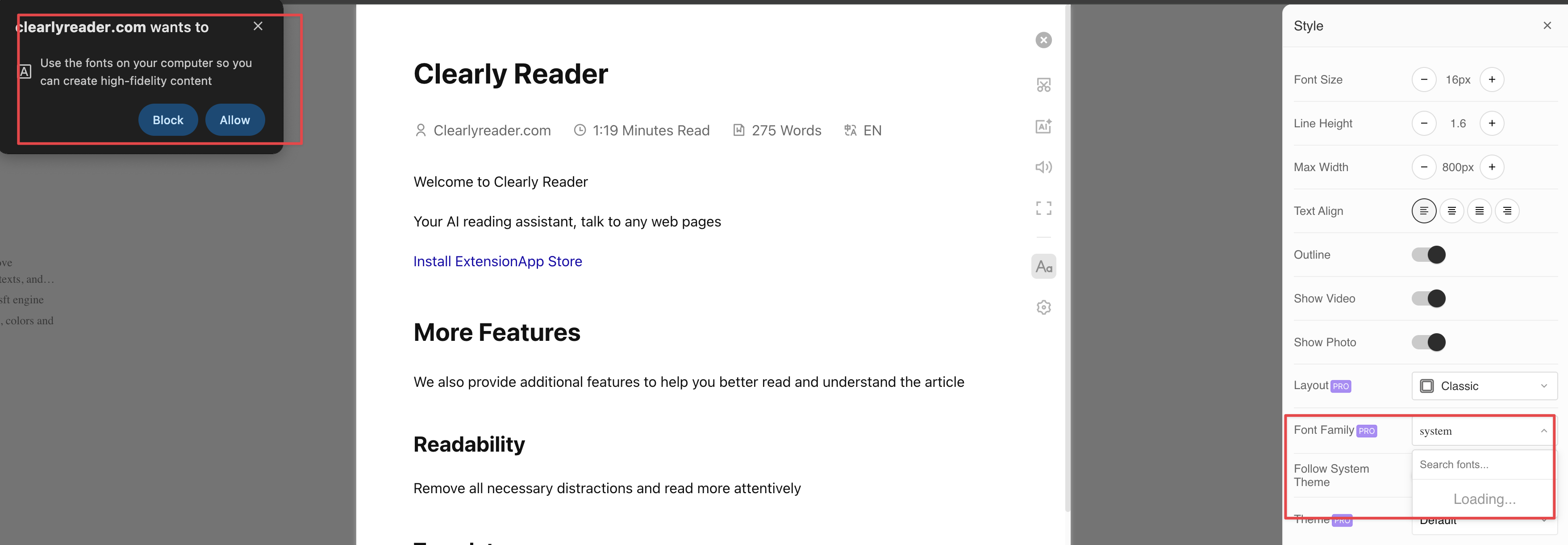 After version 4.0, when you change the font family, you will be asked for font permission to allow Clear Reader to load the font list.